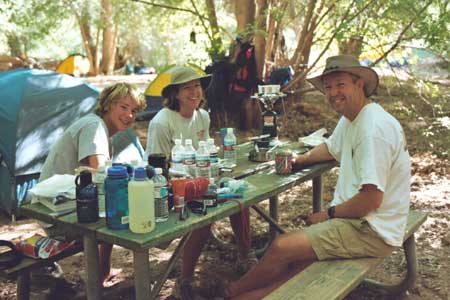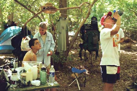 Chris, getting sunscreened up by Diane while Ed hydrates